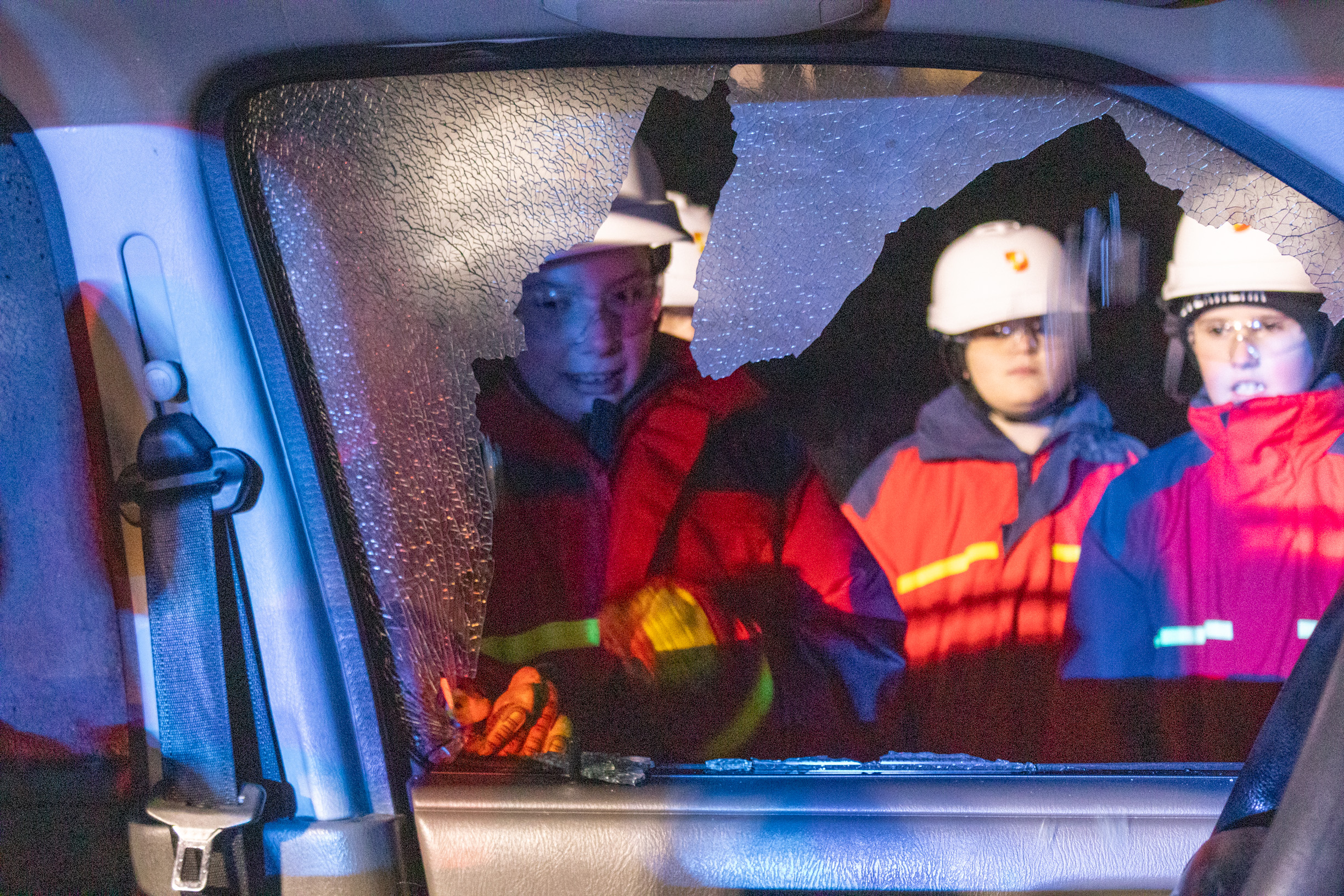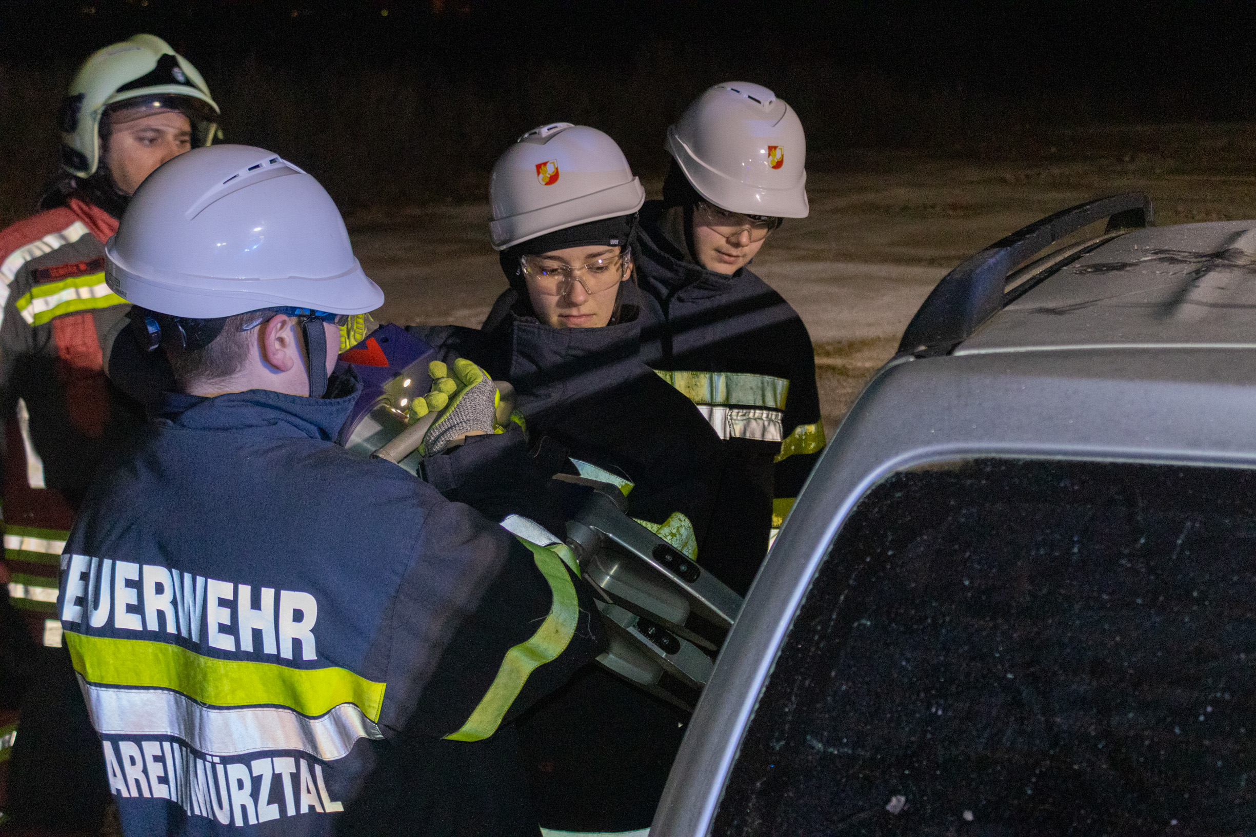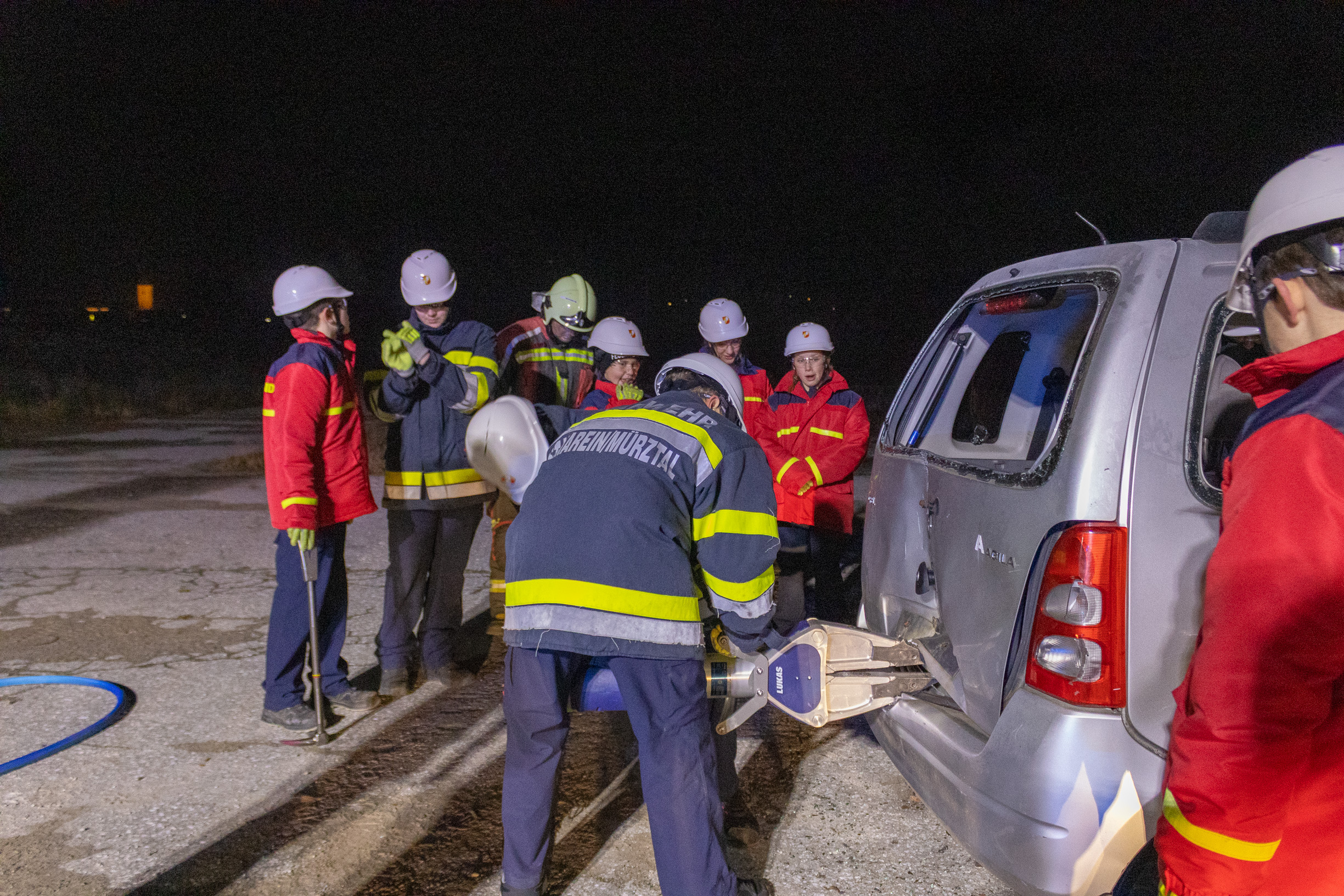 Zuerst stand ein technischer Einsatz am Programm: Ein Auto wurde mit dem hydraulischen Rettungsgerät zerlegt. Mit Spreizer und Schere konnten wir selbst Hand anlegen und unter realistischen Bedingungen üben. Unser OBI-Ausbildungsbeauftragter erklärte uns dabei genau, worauf man achten muss, zum Beispiel auf die eigene Sicherheit, das richtige Arbeiten mit den Geräten und das Zusammenspiel in der Mannschaft. So bekamen wir ein gutes Gefühl dafür, wie Einsätze später im echten Feuerwehralltag ablaufen.