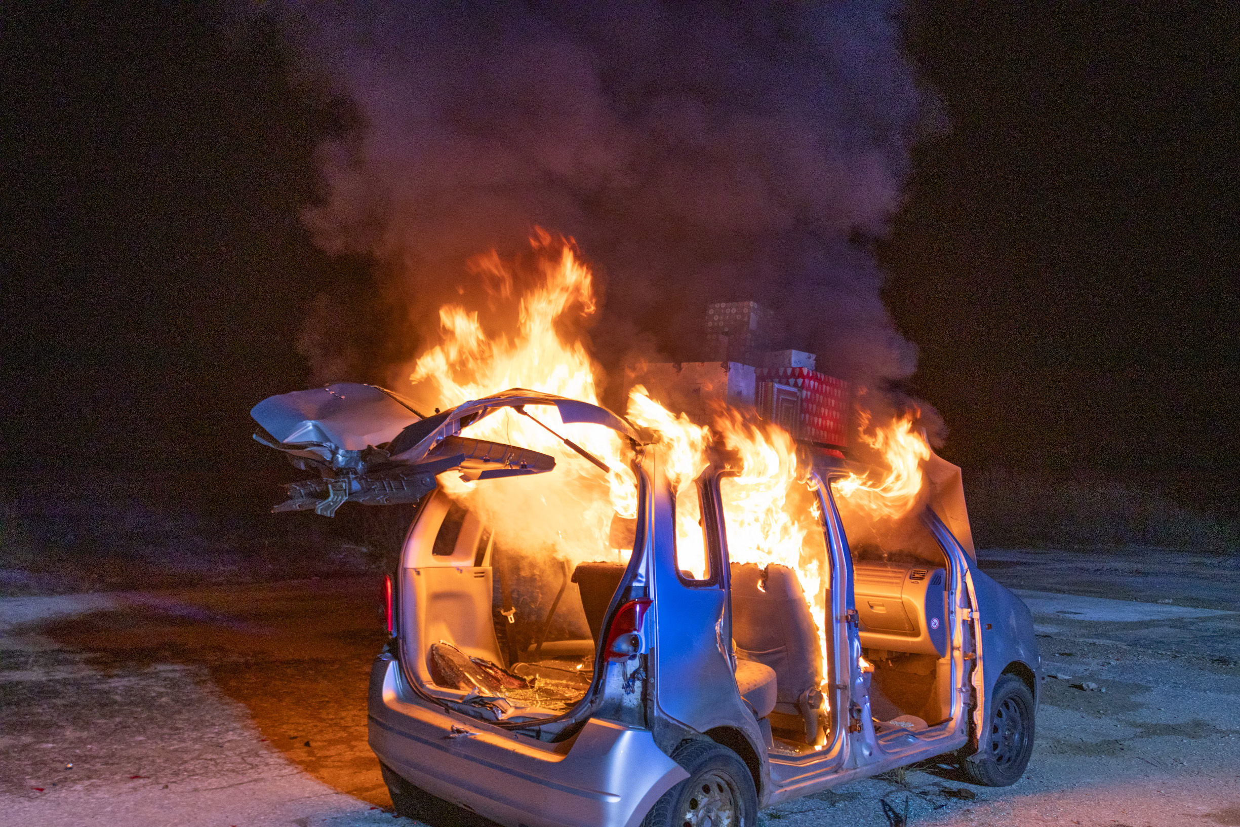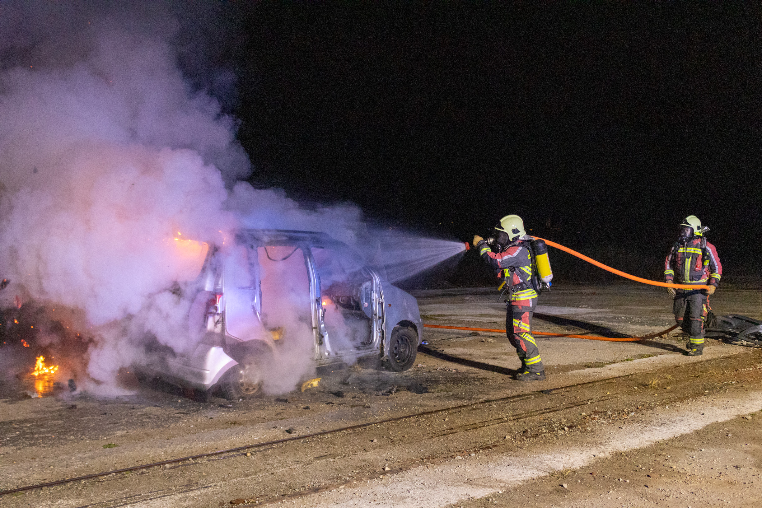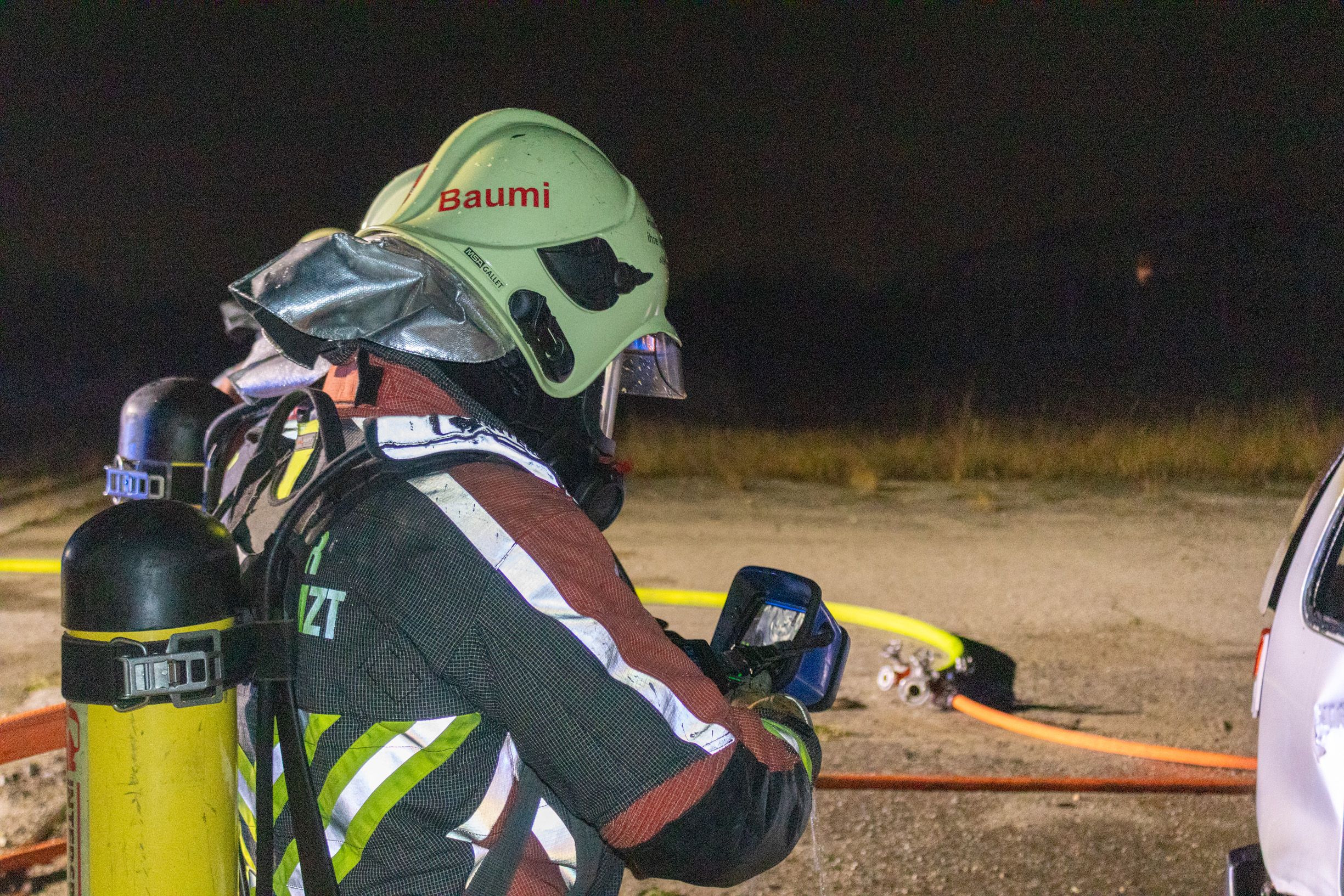 Danach wurde es heiß: Das Auto wurde angezündet und wir mussten schnell reagieren. Gemeinsam bauten wir eine Löschleitung auf und die Mannschaft führte die Löscharbeiten unter Atemschutz durch. Teamwork, Konzentration und sauberes Arbeiten waren dabei besonders wichtig.