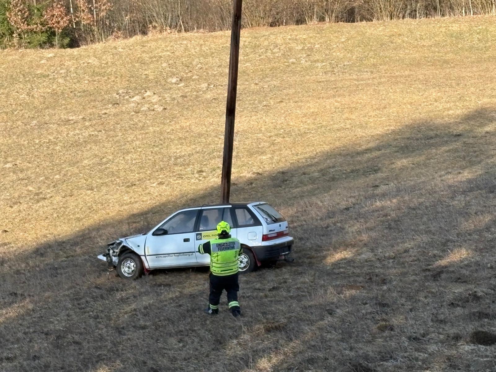 Ein Fahrzeug kam von einer Bergstraße ab und kam ca. 60m unterhalb der Straße an einem Strommasten zu stehen.