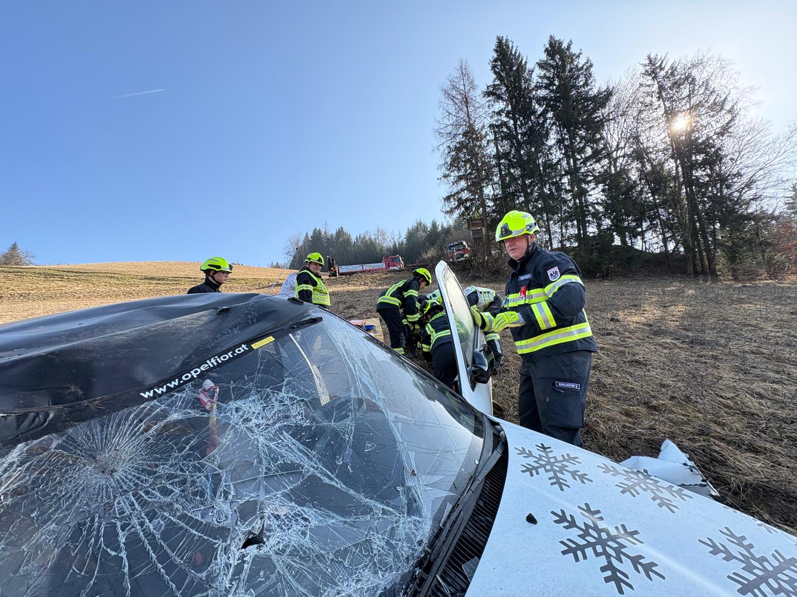 Bereits nach kurzer Zeit konnte die erste Person befreit werden. Die Rettung der zweiten Person gestaltete sich äußerst schwierig, da diese zwischen dem Fahrzeug und dem Strommasten eingeklemmt war. Diese Person musste schließlich per "Crashrettung" aus der misslichen Lage gerettet und zur Straße verbracht werden.