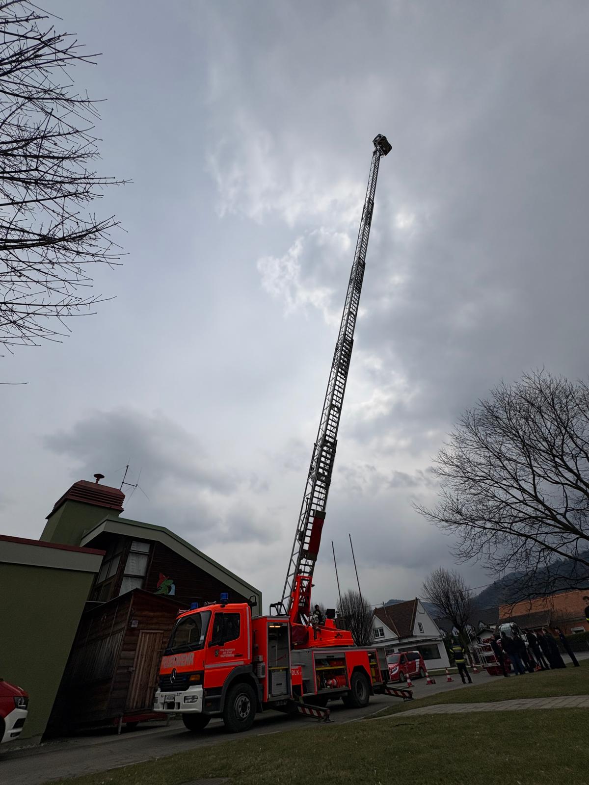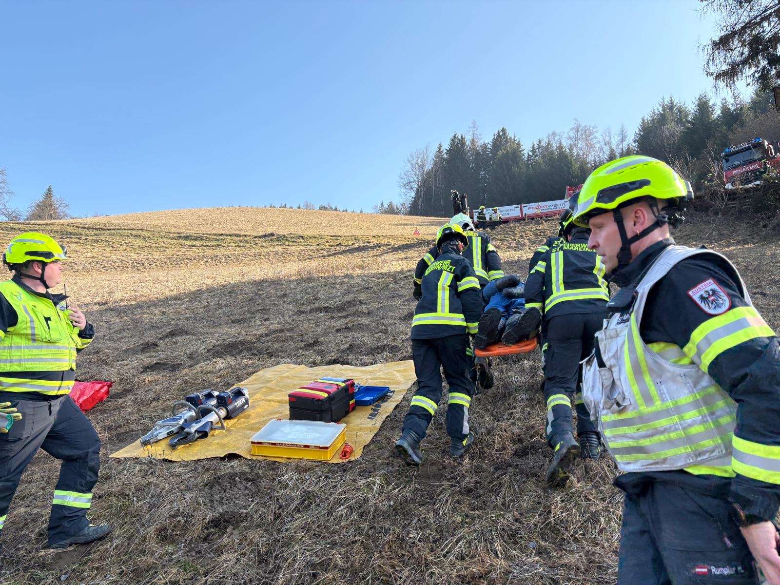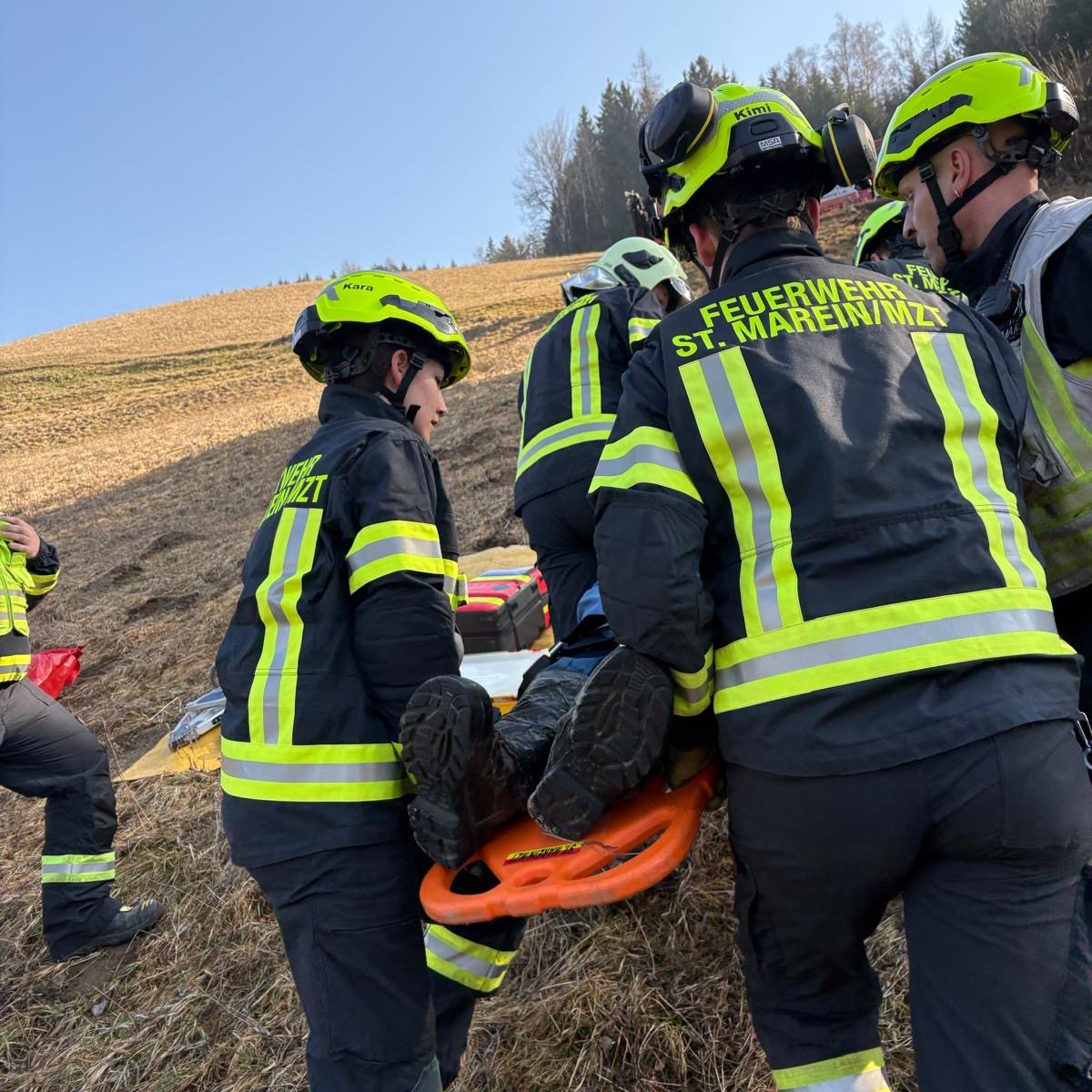 Darauf hin machten sich annähernd 20 Kamerad*innen mit MTFA, KLF, HLF4 und LKW-Kran auf dem Weg zum abgelegenen Übungsort in der Gemeinde Sankt Marein.
